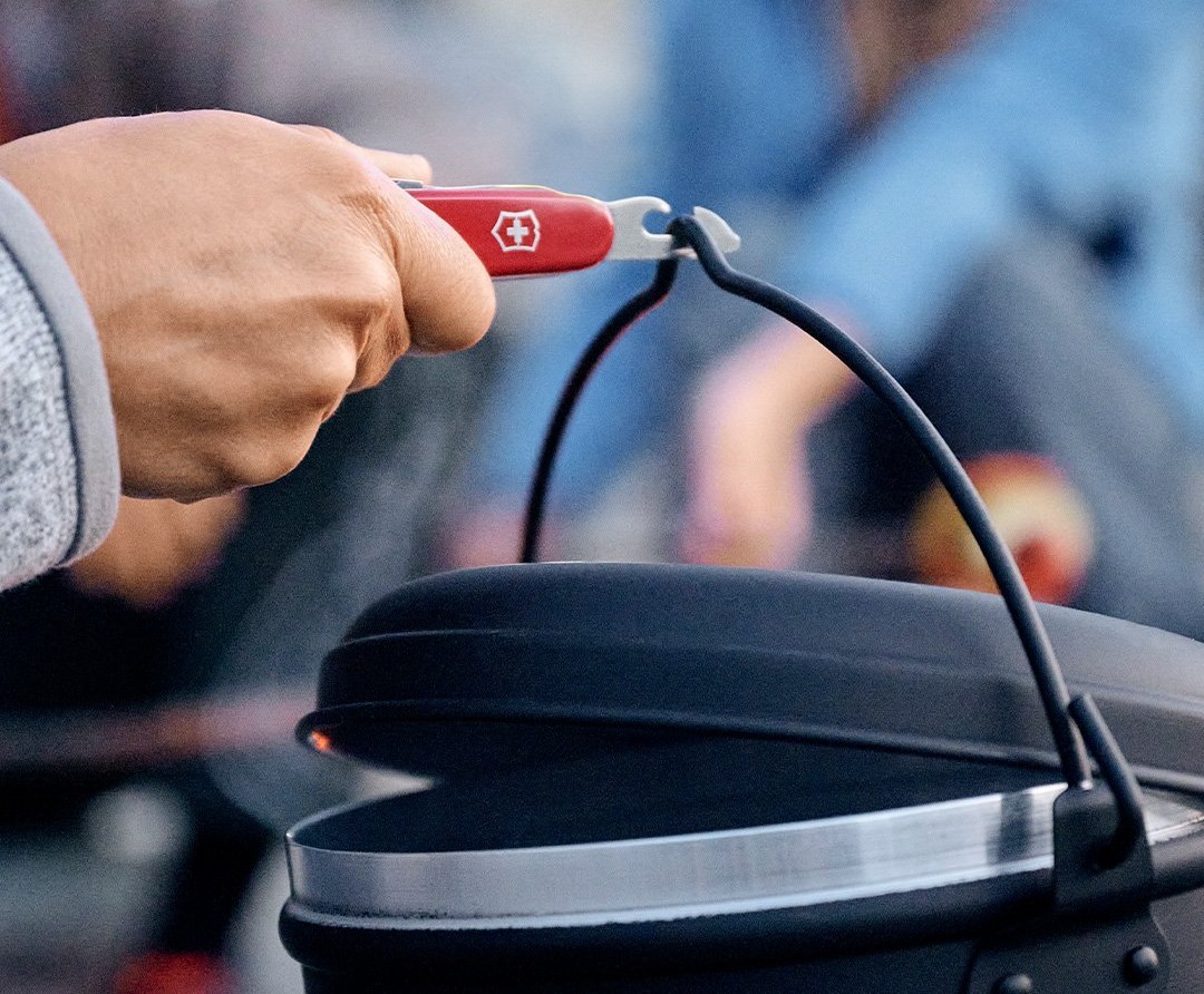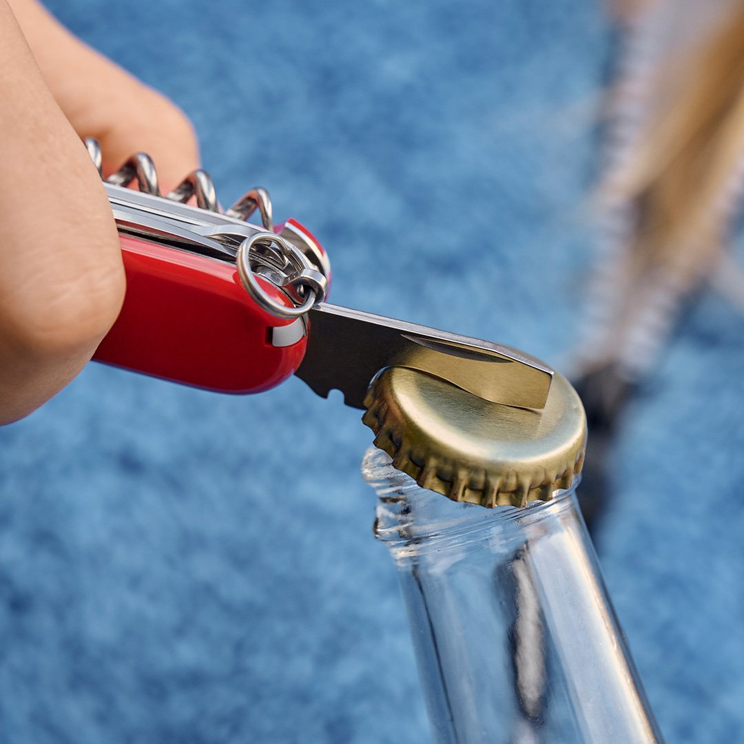 Duże ostrze / Małe ostrze / Korkociąg / Rozwiertak, szpikulec i szydło / Nożyczki / Piła do drewna / Wielofunkcyjny hak / Kółko do kluczy / Pęseta / Wykałaczka / Otwieracz do puszek / Otwieracz do kapsli / Śrubokręt 6 mm / Śrubokręt 3 mm / Przyrząd do zdejmowania izolacji