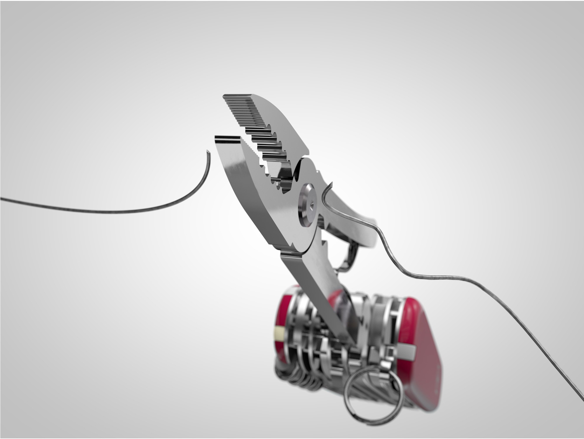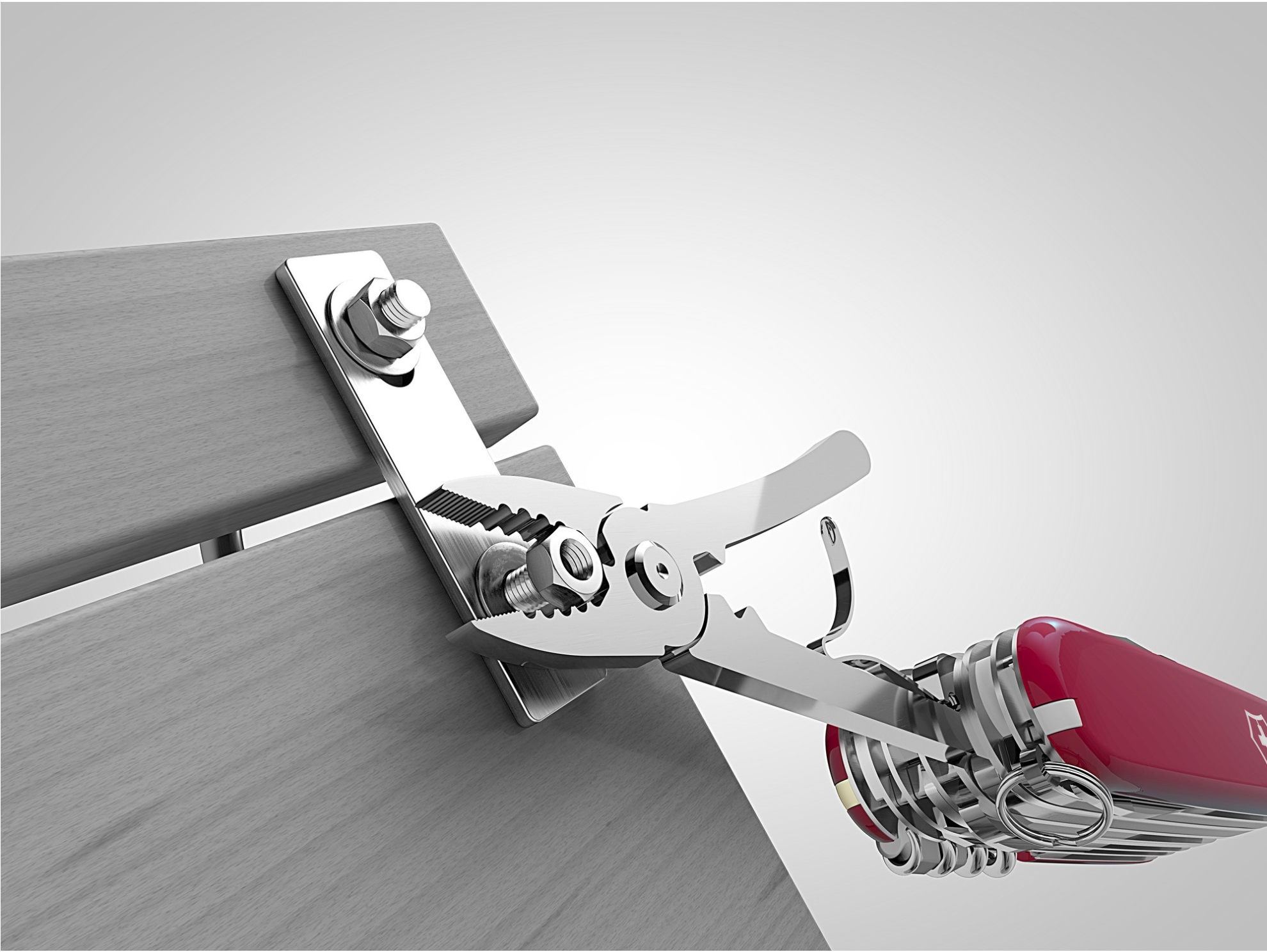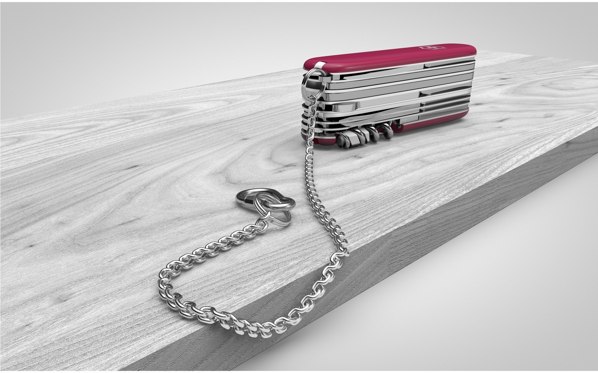 Duże ostrze / Małe ostrze / Korkociąg / Miniśrubokręt 1,5 mm / Otwieracz do puszek | Śrubokręt 3 mm / Otwieracz do kapsli | Śrubokręt 6 mm | Przyrząd do zdejmowania izolacji / Śrubokręt 2,5 mm / Rozwiertak, szpikulec i szydło / Nożyczki / Piła do drewna / Pilniczek do paznokci | Narzędzie do czyszczenia paznokci | Pilnik do metalu | Piła do metalu / Śrubokręt Philips 1 / 2 / Wielofunkcyjny hak / Kombinerki | Przecinak do drutu | Zaciskacz do drutu / Szkło powiększające / Nożyk do usuwania łusek | Przyrząd do wyhaczania | Linijka (cm) | Linijka (in) / Dłuto 4 mm / Kółko do kluczy / Szpilka / Pęseta / Wykałaczka / Długopis z wkładem napełnianym pod ciśnieniem / Skrobak do ryb / Otwieracz do kapsli / Pilniczek do paznokci / Kombinerki / Otwieracz do puszek
