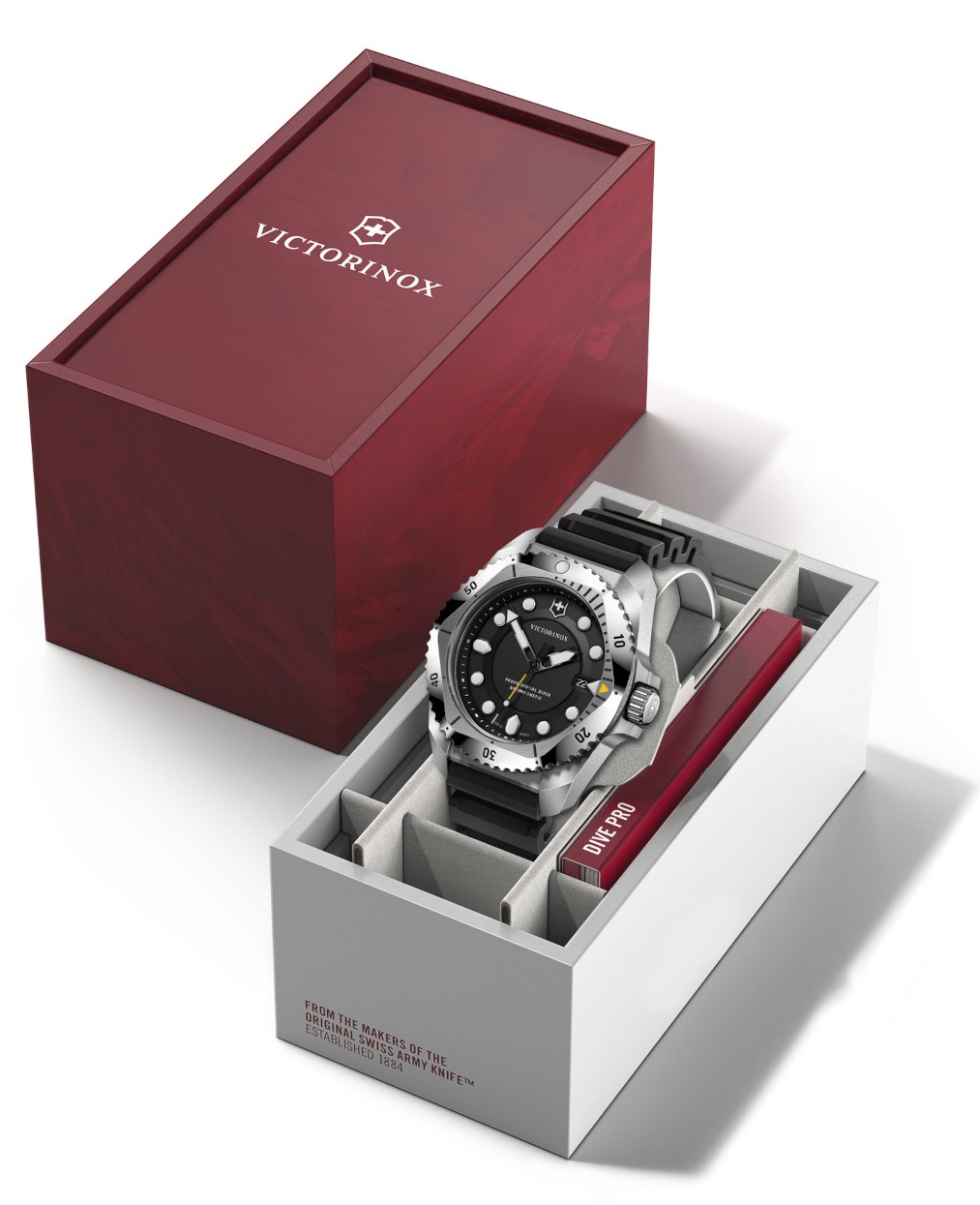 Victorinox Dive Pro są wyposażone w innowacyjny system wymiany paska bez użycia narzędzi i są dostępne nie tylko w różnych atrakcyjnych kombinacjach materiałów i kolorów, ale także z dwoma rodzajami mechanizmów: sprawdzonym i niezawodnym mechanizmem kwarcowym Ronda 715 i nowy automatyczny mechanizm Sellita SW 220-1. Posiada 38-godzinną rezerwę chodu oraz wyświetlacz daty i dnia z możliwością szybkiego ustawiania. Przejrzysta tarcza ma charakterystyczne indeksy punktowe i wskazówki, które świecą dwoma kolorami szwajcarskiej technologii Super-LumiNova® – niebieskim do nurkowania i zielonym do wskaźników czasu.