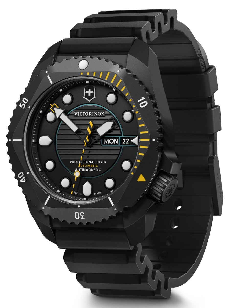 Victorinox Dive Pro są wyposażone w innowacyjny system wymiany paska bez użycia narzędzi i są dostępne nie tylko w różnych atrakcyjnych kombinacjach materiałów i kolorów, ale także z dwoma rodzajami mechanizmów: sprawdzonym i niezawodnym mechanizmem kwarcowym Ronda 715 i nowy automatyczny mechanizm Sellita SW 220-1. Posiada 38-godzinną rezerwę chodu oraz wyświetlacz daty i dnia z możliwością szybkiego ustawiania. Przejrzysta tarcza ma charakterystyczne indeksy punktowe i wskazówki, które świecą dwoma kolorami szwajcarskiej technologii Super-LumiNova® – niebieskim do nurkowania i zielonym do wskaźników czasu.