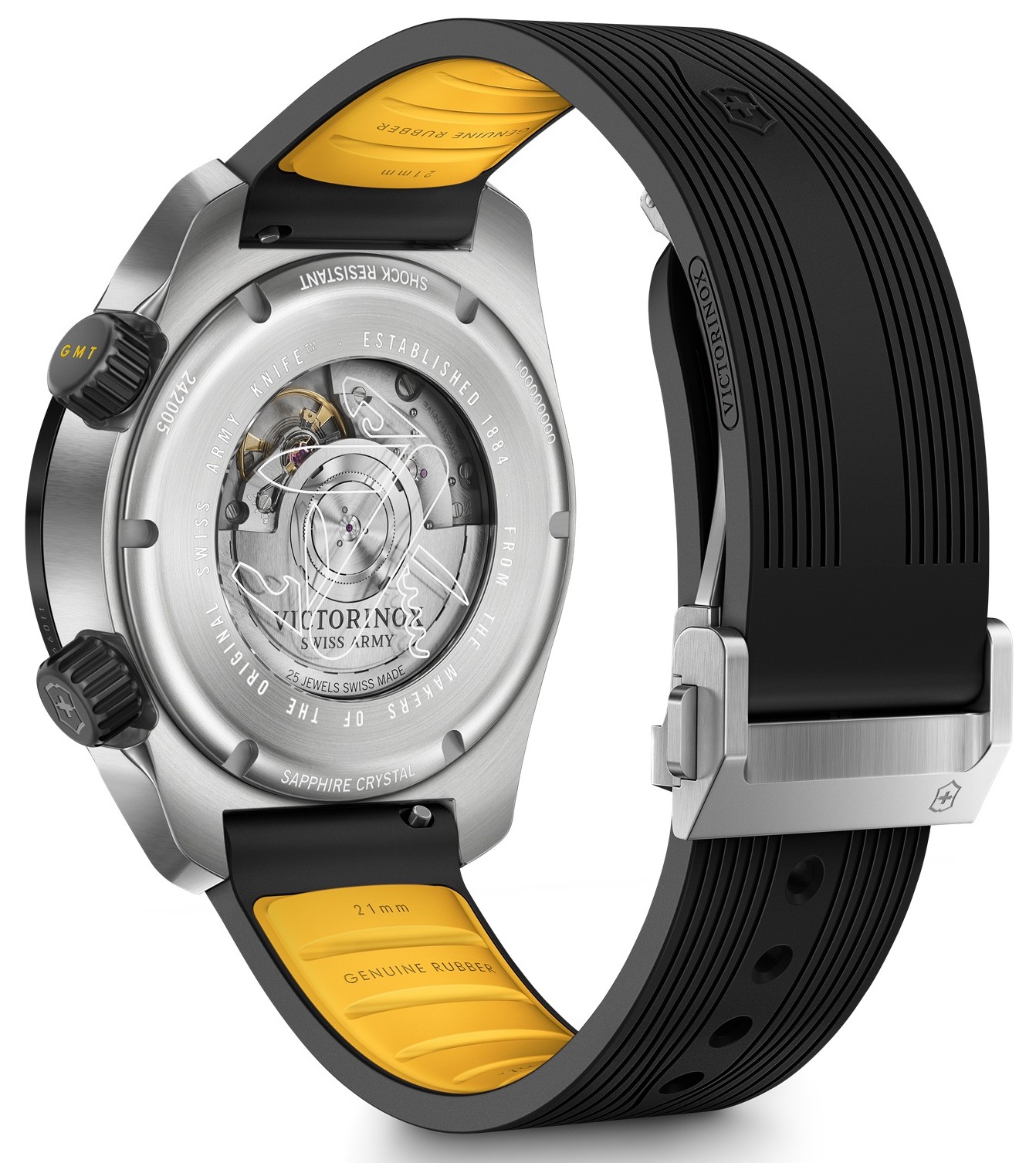 Posiada dwie koronki: zakręcaną na godzinie 4 do wskazywania czasu i koronkę na godzinie 2 do funkcji GMT. Zegarek Air Pro oferuje doskonałą czytelność nawet w ciemności dzięki charakterystycznym wskazówkom i indeksom wypełnionym masą luminescencyjną Super-LumiNova®. Dzięki odporności na wstrząsy i wodoodporności zgodnej z normą ISO, zegarek ten jest gotowy na każdą aktywność.